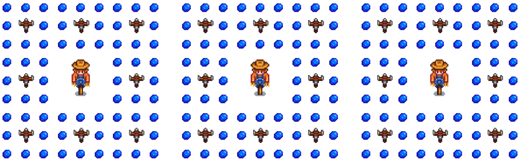 Buy blueberry seeds according to how many quality sprinklers you managed to make. Having 8 quality sprinklers around a scarecrow works very well. The Four Corners farm - a great farm for organization - can accomodate a layout of 24 quality sprinklers, watering 192 blueberries in front of the farmhouse: